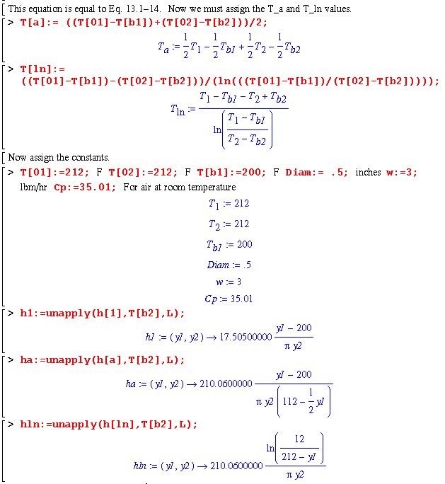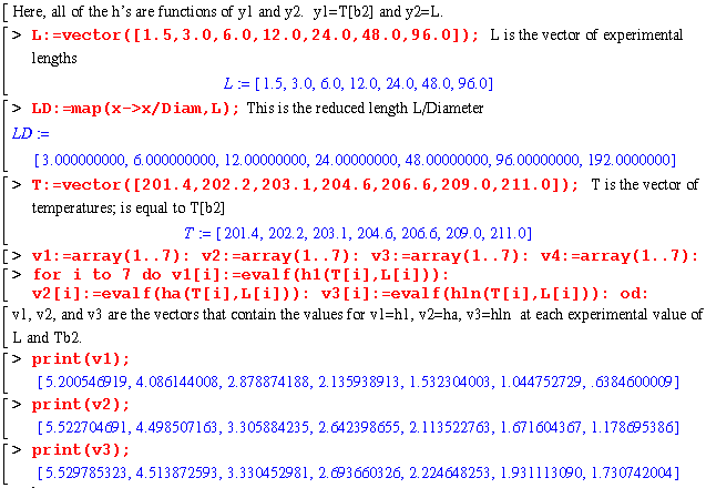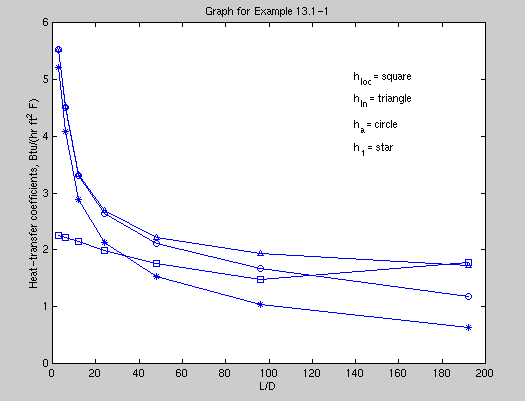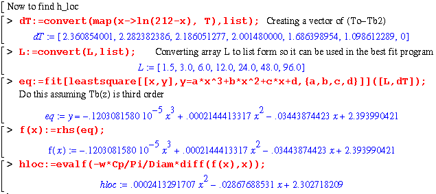 Plugging the vectors for all of the h's into Matlab gives the following graph. This graph matches precisely for the values of h1, ha, and hln. Hloc is calculated from the slope of the best fit curve of ln(To-Tb) vs. L from Maple and evaluated in Eq. 13.1-18. Hloc varies somewhat, but approaches its minimum value at the same asymptote that hln is approaching. You can see that hloc approaches the asymptote more rapidly than hln though.
