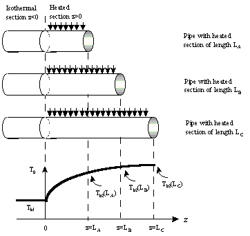 This example involves calculating heat transfer coefficients from experimental data by heating air in tubes of various lengths. Air is flowing with fully developed laminar velocity profiles in each tube at a temperature of 200 F. At z=0, the temperature of each pipe is suddenly increased to 212 F. The air temperature at the exit of each tube is measured. The following picture is a representation of Fig. 13.1-2.